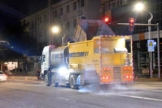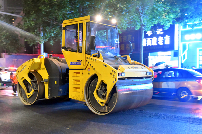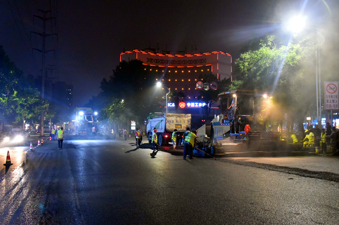 為加快施工進度,最大程度地減少對周邊居民的影響,自進駐施工以來,項目部克服交通壓力大,天氣炎熱,沿線車輛多等困難,投入施工技術人員和交通協(xié)管人員20余人,銑刨機、挖掘機、攤鋪機、壓路機、各類運輸車輛等機械設備30余臺,采取半幅施工的方式,24小時晝夜奮戰(zhàn)。6月16日晚,為保證最后階段的瀝青混凝土攤鋪施工,公司從各部門抽調人員協(xié)助項目現(xiàn)場的交通管理,全力保障倉庫路提前完工通車。